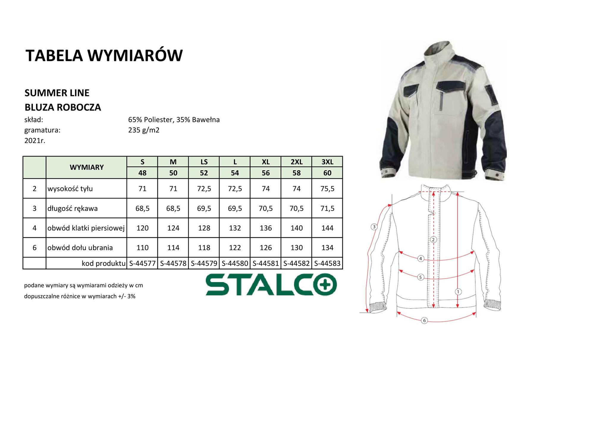 S-44577 jest to bluza robocza SUMMER LINE – uniwersalna odzież ochronna, idealna do prac budowlanych, dekarskich, instalacyjnych, ogrodniczych i ślusarskich. Wykonana z jasnego, trwałego materiału z dodatkiem bawełny, zapewnia komfort noszenia, dobrą cyrkulację powietrza oraz ochronę przed przegrzaniem – jasna kolorystyka odbija promienie słoneczne. Tkanina jest przyjemna w dotyku i łatwa w utrzymaniu czystości, co sprawia, że ubranie przez długi czas wygląda estetycznie.
