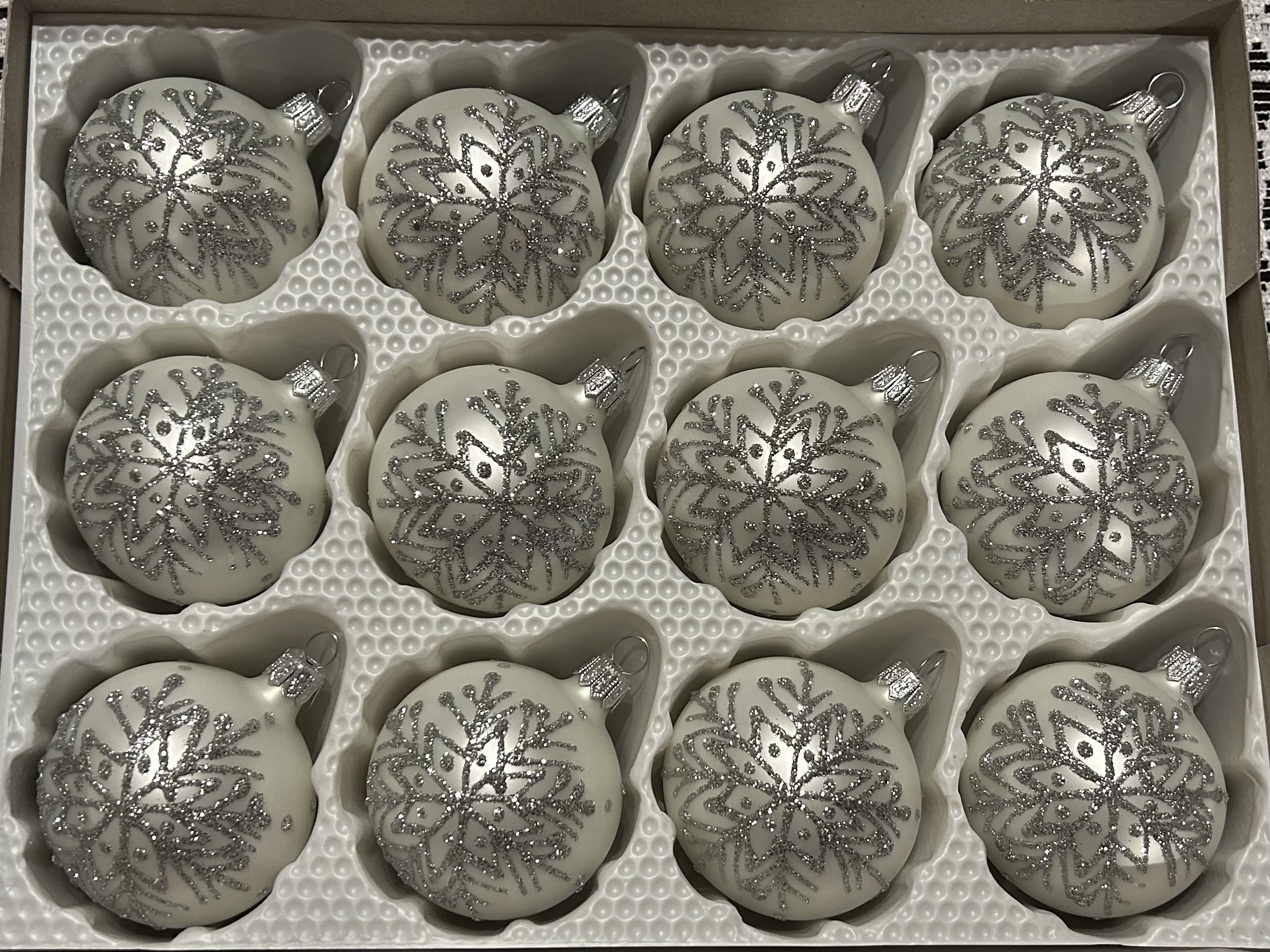 Zestaw 6 sztuk ręcznie malowanych szklanych bombek o średnicy 8 cm.