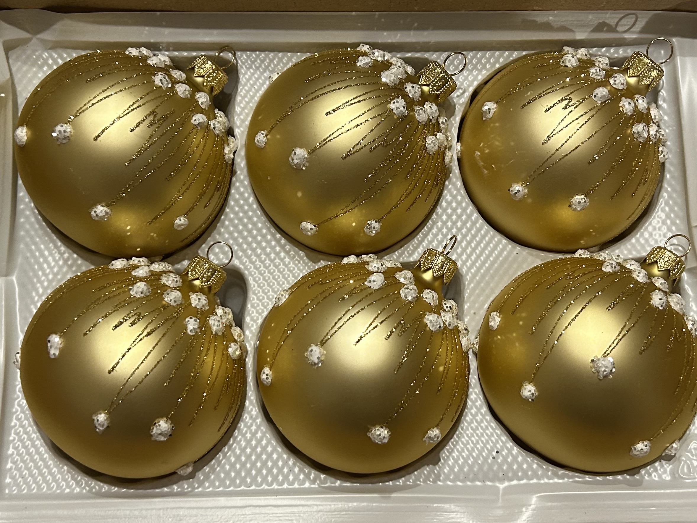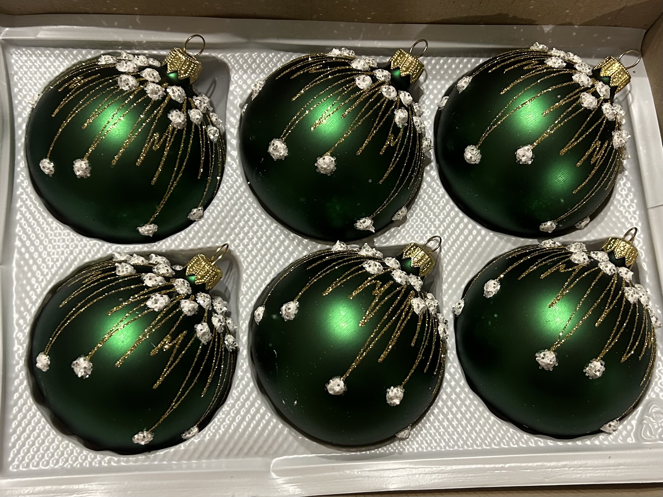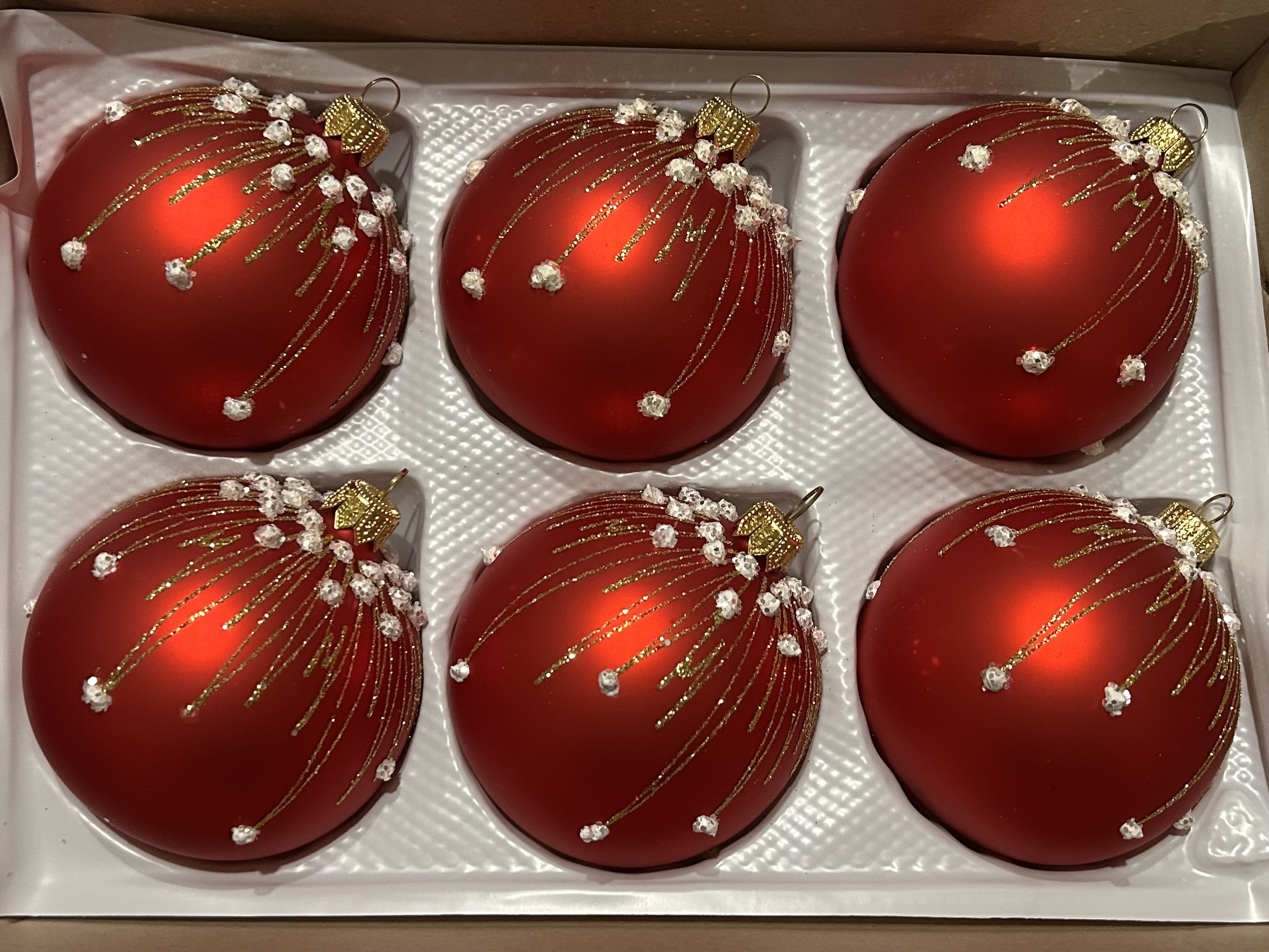 Zestaw 6 sztuk ręcznie malowanych szklanych bombek o średnicy 8 cm.