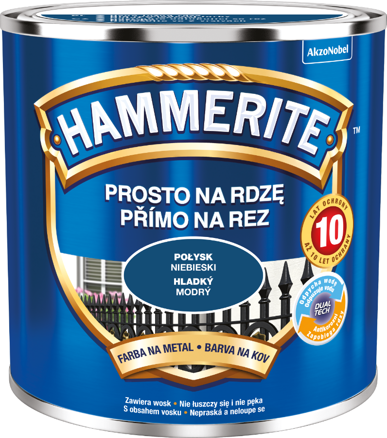 Hammerite Prosto Na Rdzę to farba, którą sotsuje się do antykorozyjnego i dekoracyjnego malowania metali żelaznych, takich jak stal i żeliwo. Zarówno tych pokrytych rdzą, jak i czystych.