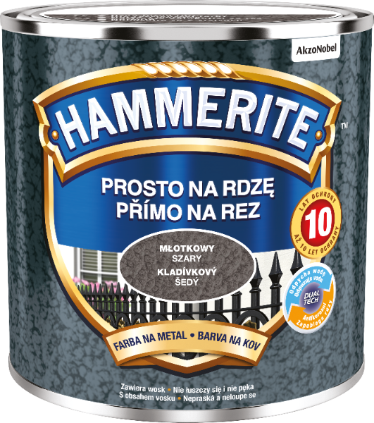 Hammerite Prosto Na Rdzę to farba, którą sotsuje się do antykorozyjnego i dekoracyjnego malowania metali żelaznych, takich jak stal i żeliwo. Zarówno tych pokrytych rdzą, jak i czystych.