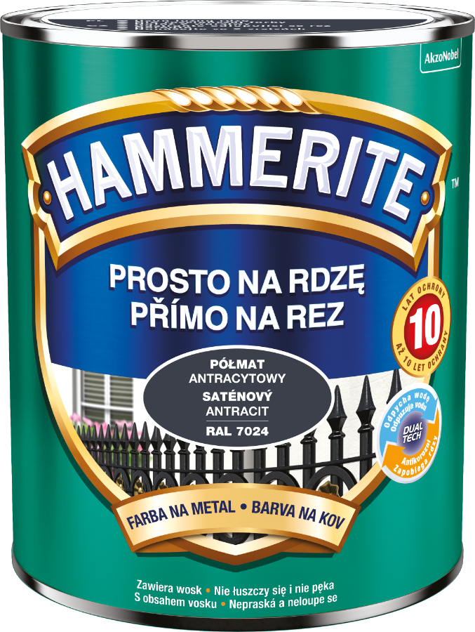 Hammerite Prosto Na Rdzę to farba, którą sotsuje się do antykorozyjnego i dekoracyjnego malowania metali żelaznych, takich jak stal i żeliwo. Zarówno tych pokrytych rdzą, jak i czystych.