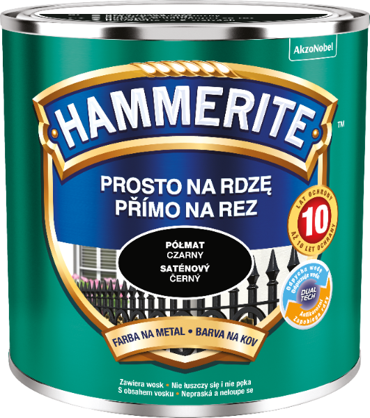 Hammerite Prosto Na Rdzę to farba, którą stosuje się do antykorozyjnego i dekoracyjnego malowania metali żelaznych, takich jak stal i żeliwo. Zarówno tych pokrytych rdzą, jak i czystych.