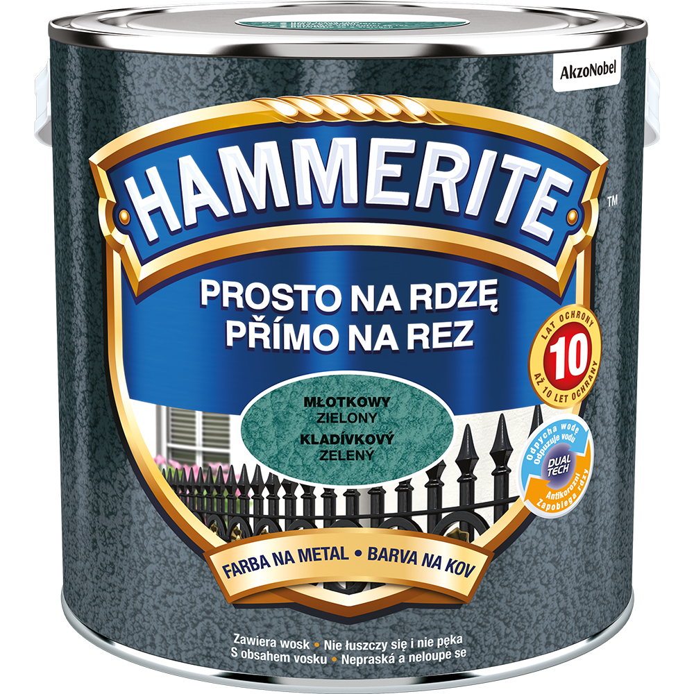 Hammerite Prosto Na Rdzę to farba, którą stosuje się do antykorozyjnego i dekoracyjnego malowania metali żelaznych, takich jak stal i żeliwo. Zarówno tych pokrytych rdzą, jak i czystych.