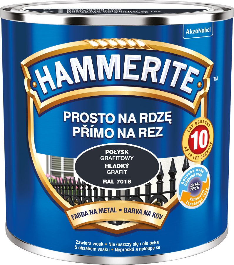 Hammerite Prosto Na Rdzę to farba, którą stosuje się do antykorozyjnego i dekoracyjnego malowania metali żelaznych, takich jak stal i żeliwo. Zarówno tych pokrytych rdzą, jak i czystych.