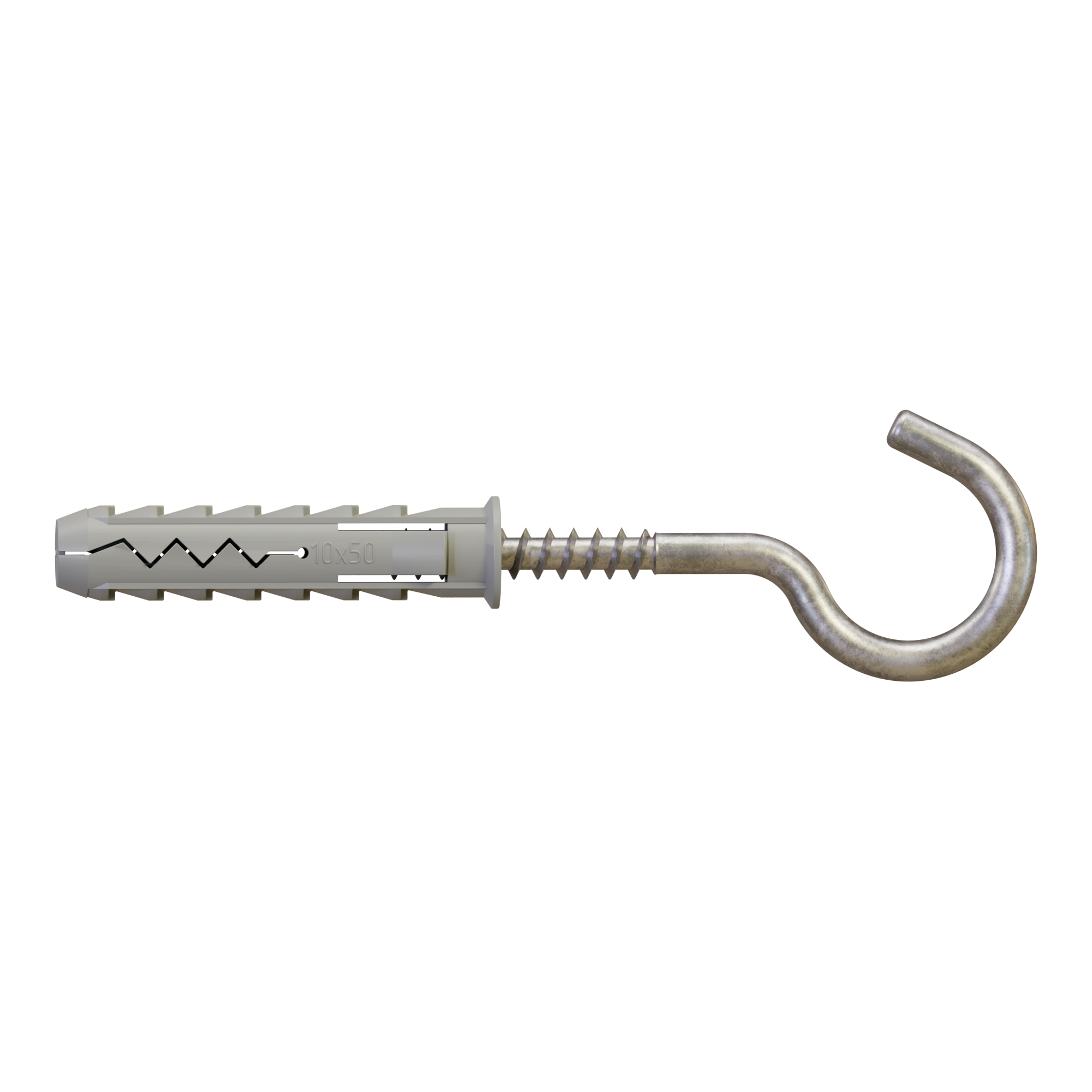 Kołek rozporowy z hakiem sufitowym to element wykorzystywany w pracach budowlanych i montażowych. Składa się z polipropylenowej koszulki, która rozpiera się w otworze, oraz wkrętu ze stali ocynkowanej zakończonego półokrągłym hakiem.