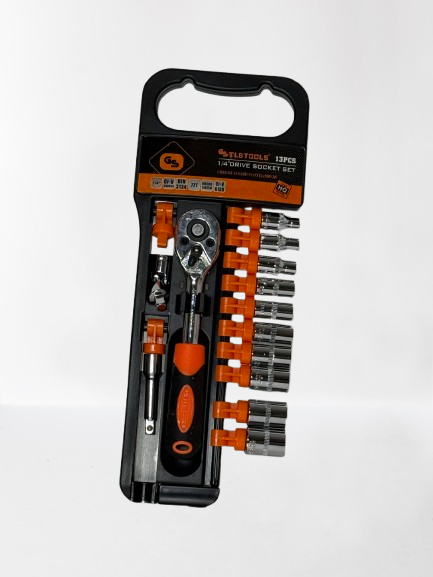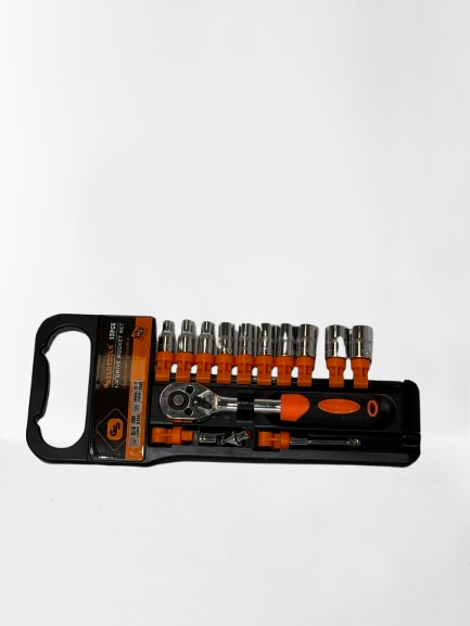 Praktyczny zestaw kluczy nasadowych 1/4″ składający się z 13 elementów, idealny do domowego użytku, warsztatu i serwisu samochodowego. Komplet zawiera grzechotkę 1/4″, przedłużkę, przegłub oraz 10 nasadek 1/4″ ( 4, 5, 6, 7, 8, 9, 10, 11, 12, 13 mm).
