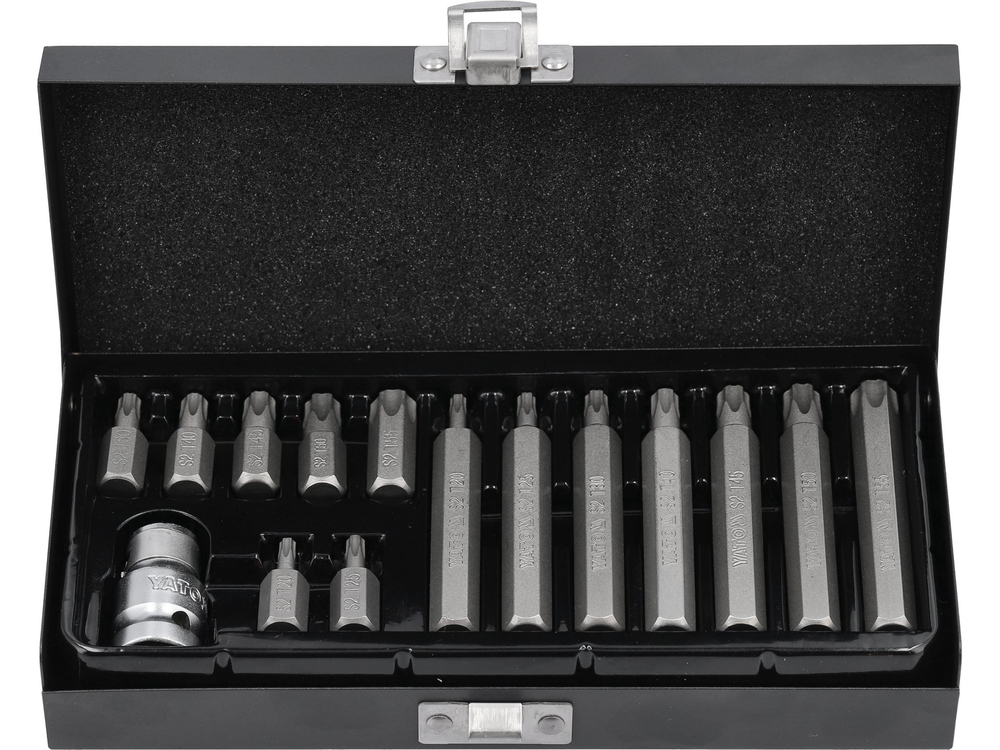 Końcówki wkrętakowe TORX SECURITY marki Yato YT-0417 to praktyczny zestaw 15 elementów do pracy ze śrubami zabezpieczonymi bolcem.