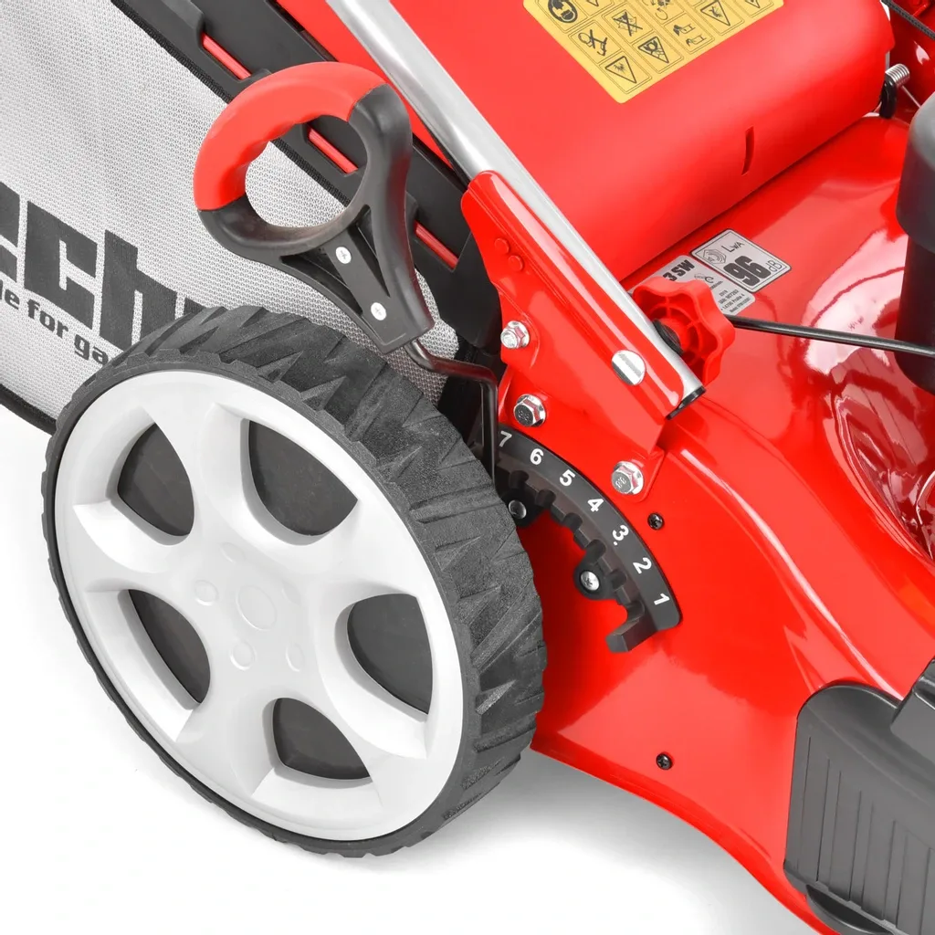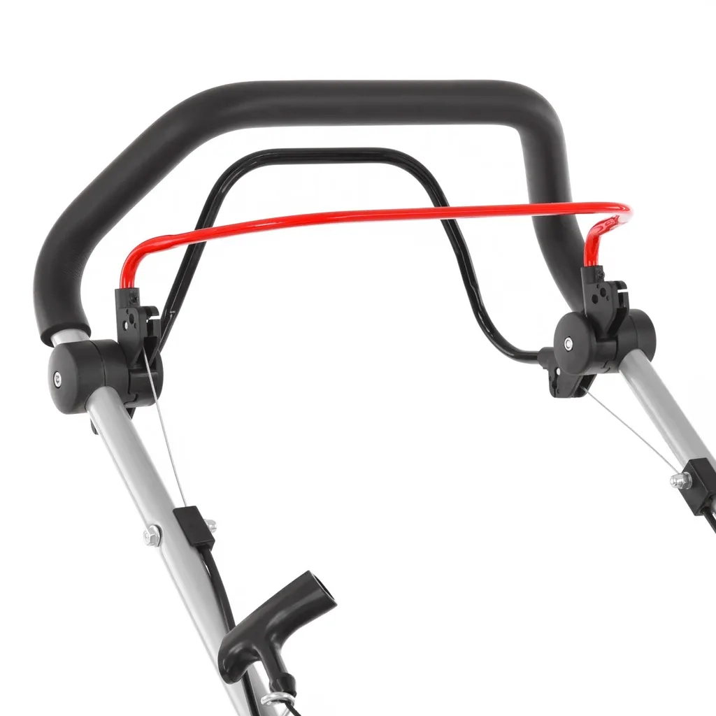 Kosiarkę uruchamia się tradycyjnym szarpakiem. Czerwona dźwignia na uchwycie służy do sterowania pracą noża, a czarna – do uruchamiania napędu tylnej osi. Prędkość jazdy wynosi ok. 3,6 km/h, choć zależy to od rodzaju terenu. Regulowany uchwyt można dopasować do wzrostu użytkownika, a w razie potrzeby szybko złożyć do transportu lub przechowywania.
