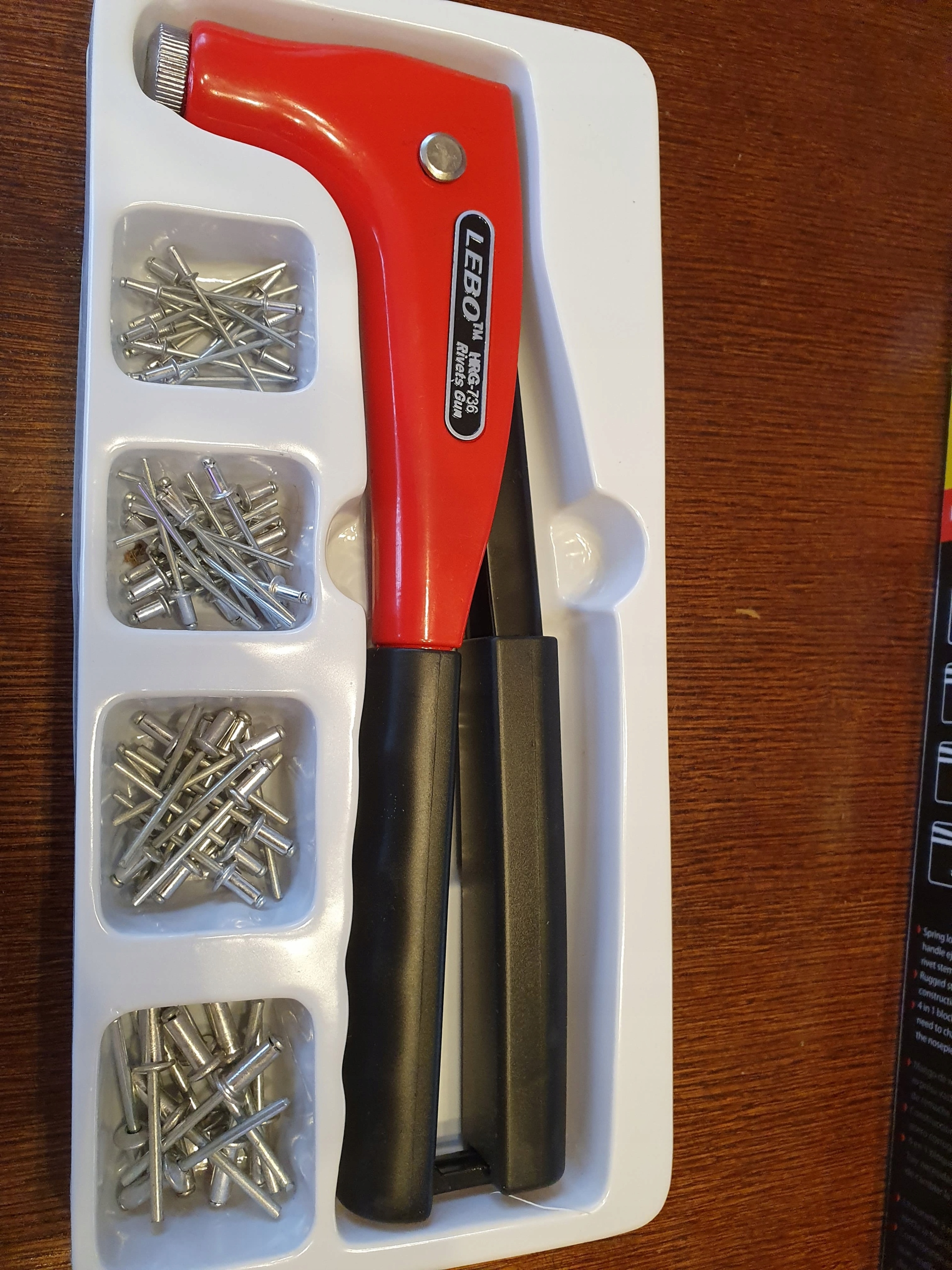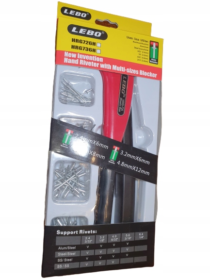 Obsługuje nity o rozmiarach: 2,4 mm, 3,2 mm, 4,0mm, 4,8mm. (stalowe, aluminiowe)
