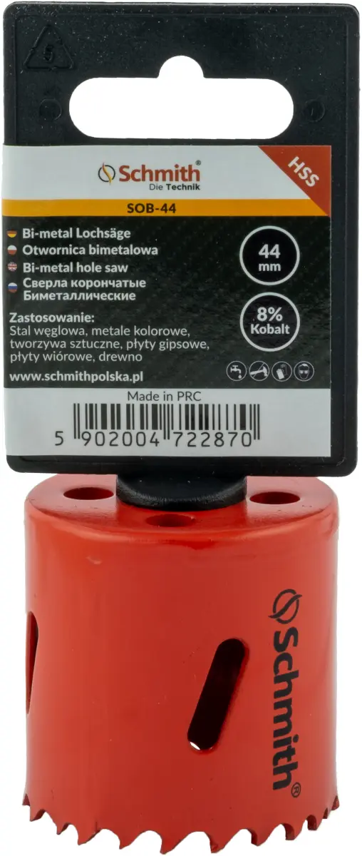 Bimetalowa otwornica Schmith 44 mm to uniwersalne narzędzie przeznaczone do wiercenia w szerokiej gamie materiałów, takich jak stal, stal nierdzewna, aluminium, metale nieżelazne, drewno czy tworzywa sztuczne.