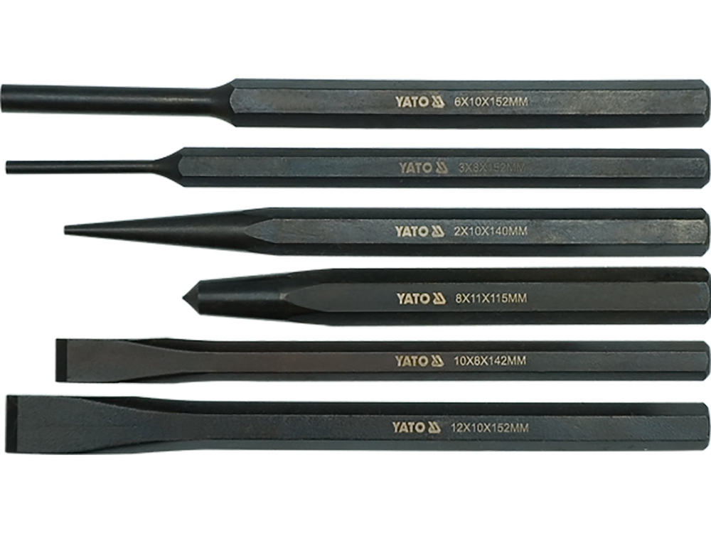YATO YT-4712 Przecinaki i punktaki 6 szt., CrV – kompaktowy zestaw warsztatowy 6 narzędzi ze stali CrV do prac w metalu. Zawiera 2 przecinaki płaskie, kilka wybijaków i punktak, wszystkie o profilu sześciokątnym i różnej długości.
