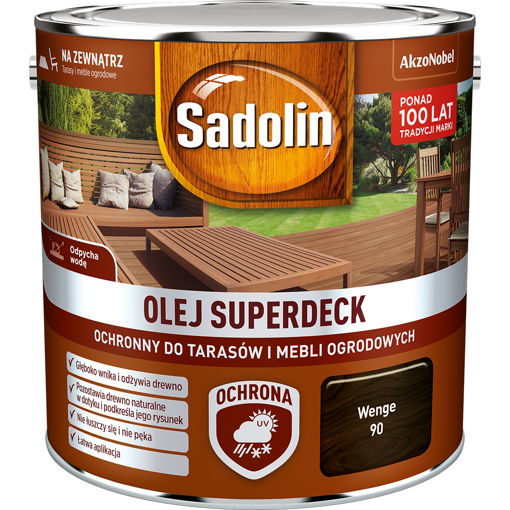 Sadolin Superdeck to specjalistyczny olej do drewna przeznaczony do tarasów i mebli ogrodowych, zaprojektowany z myślą o ochronie powierzchni drewnianych eksponowanych na czynniki atmosferyczne. Dzięki wysokiej zawartości żywic i naturalnych olejów, preparat głęboko wnika w strukturę drewna, skutecznie je odżywiając oraz wzmacniając. Ponadto podkreśla rysunek słojów i uszlachetnia wygląd drewna, pozostawiając estetyczne matowe wykończenie i naturalny dotyk.