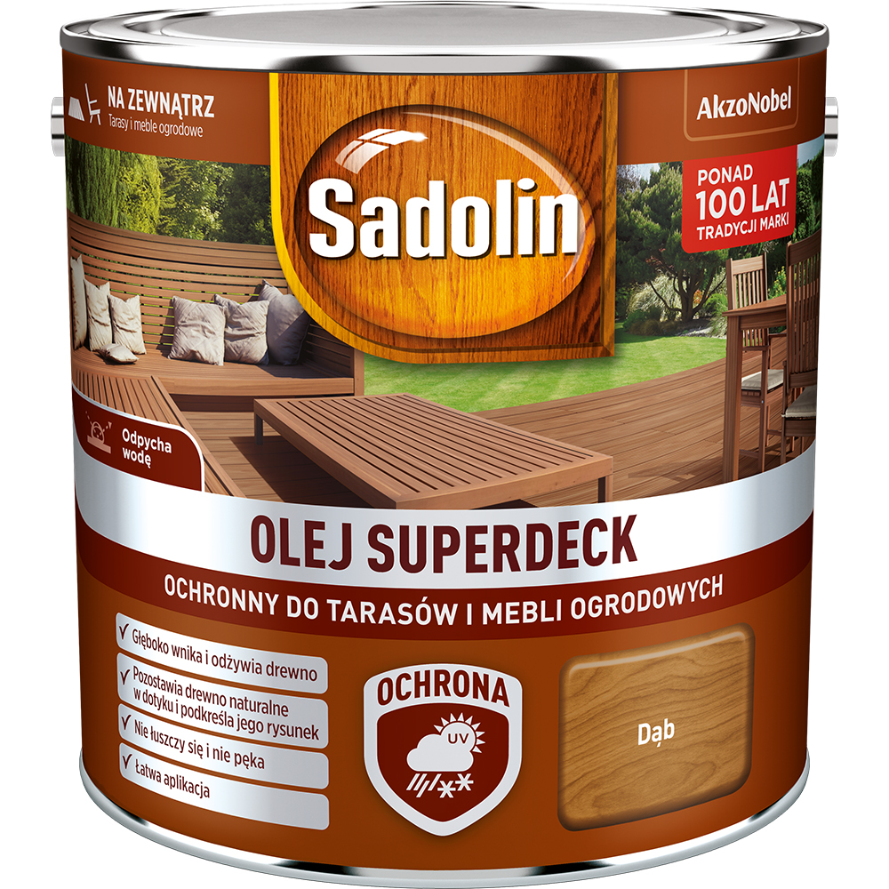 Sadolin Superdeck to specjalistyczny olej do drewna przeznaczony do tarasów i mebli ogrodowych, zaprojektowany z myślą o ochronie powierzchni drewnianych eksponowanych na czynniki atmosferyczne. Dzięki wysokiej zawartości żywic i naturalnych olejów, preparat głęboko wnika w strukturę drewna, skutecznie je odżywiając oraz wzmacniając. Ponadto podkreśla rysunek słojów i uszlachetnia wygląd drewna, pozostawiając estetyczne matowe wykończenie i naturalny dotyk.