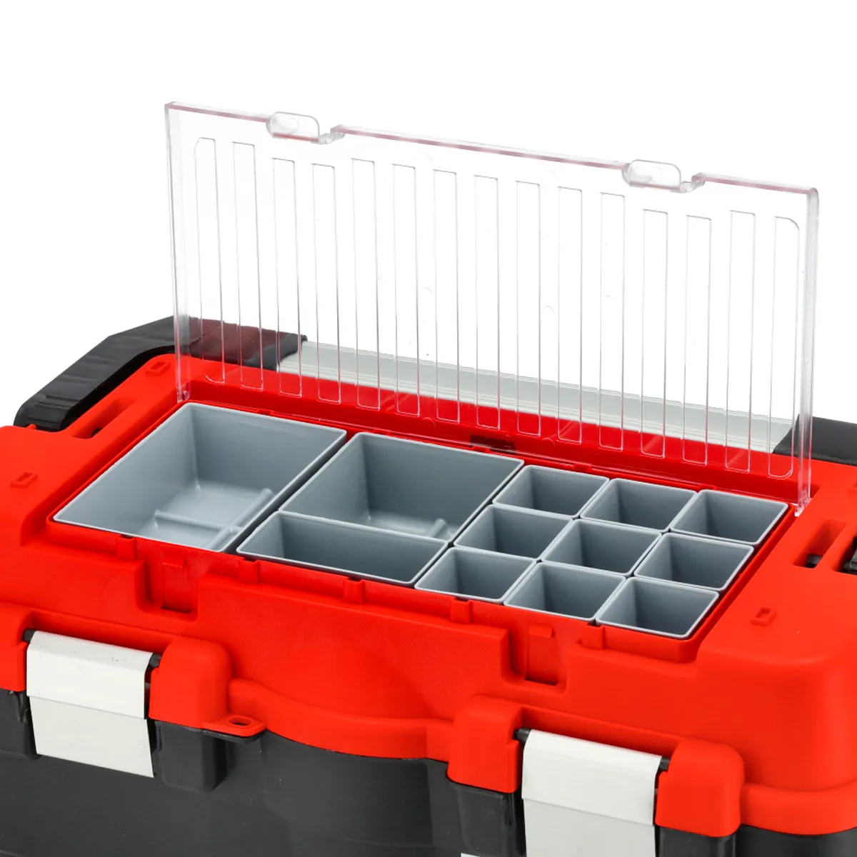 Wnętrze zawiera głębokie tacki i wyjmowane przegródki, co ułatwia przechowywanie narzędzi i drobiazgów (śrubki, gwoździe, nasadki). Pokrywę wykonano z poliwęglanu — z przezroczystym organizerem.