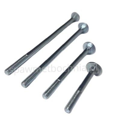 Charakterystyczny półokrągły (grzybkowy) łeb oraz kwadratowe podsadzenie pod łbem zapobiegają obracaniu się śruby podczas montażu.