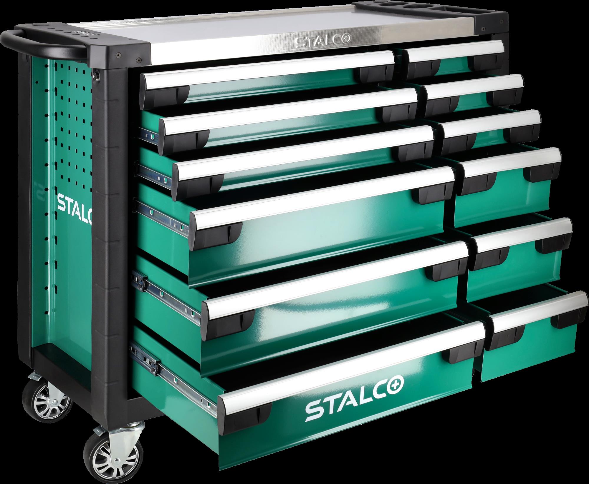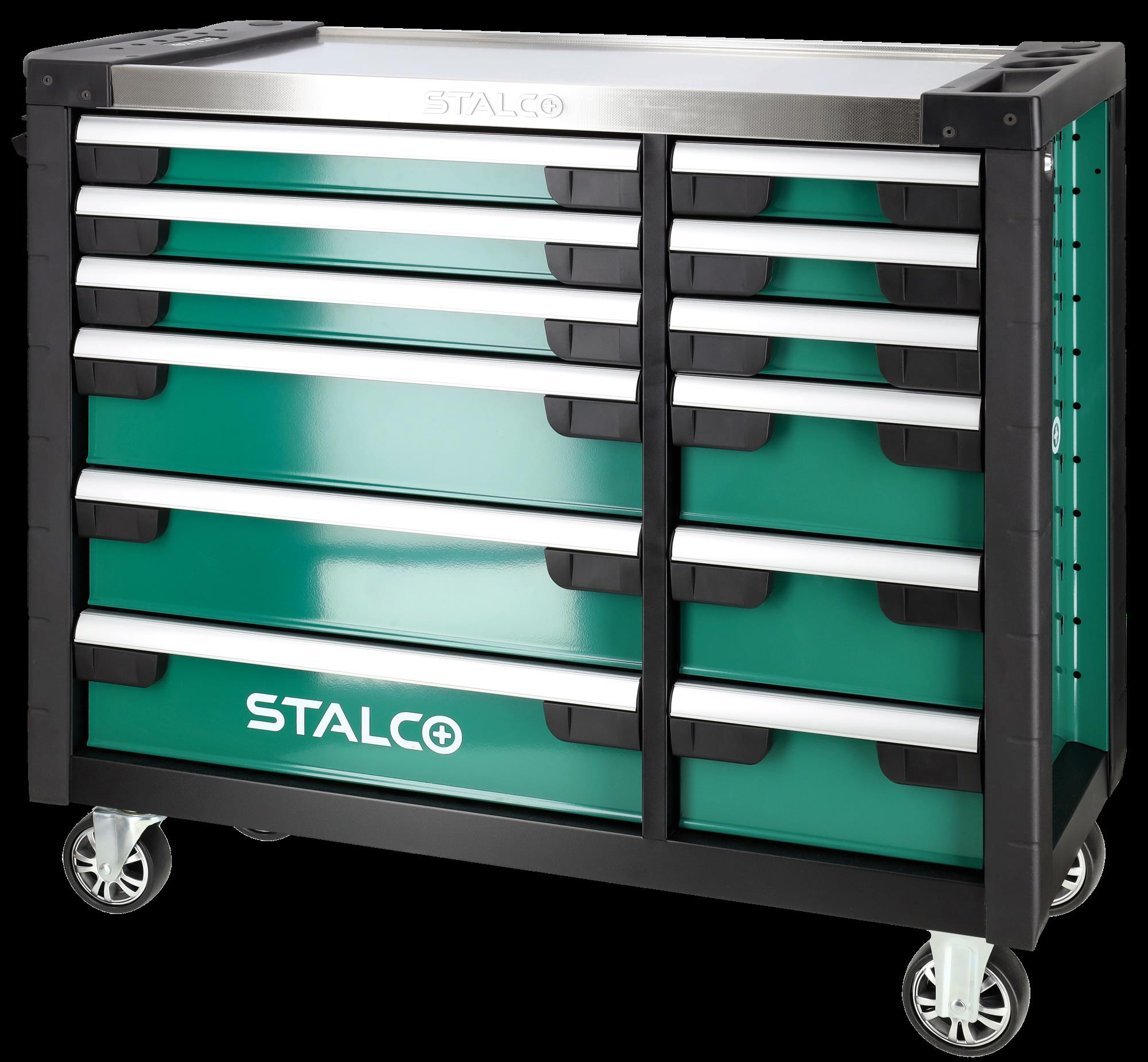 Szafka narzędziowa STALCO S026300012 to solidne, profesjonalne wyposażenie warsztatowe – mobilna konstrukcja z 12 szufladami, blat roboczy pokryty blachą nierdzewną, koła z blokadą oraz centralny zamek.