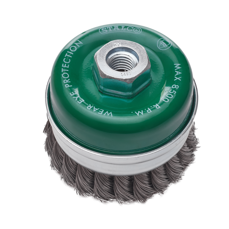 Szczotka czołowa STALCO to praktyczne narzędzie wykorzystywane podczas różnorodnych prac szlifierskich. Została wykonana ze splatanego drutu stalowego, którego ostre końcówki tworzą efektywną powierzchnię roboczą.