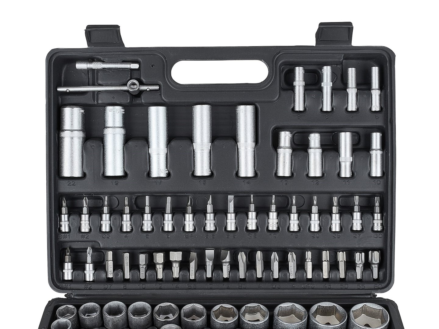 Zestaw 108-elementowy kluczy nasadowych i bitów. Całość narzędzi wykonano ze stali chromowo-wanadowej.